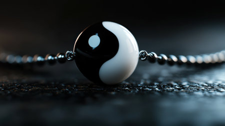A beautifully designed yin yang pendant made of black and white materials lies on a dark textured surface, showing harmony and balance in an artistic manner under soft lighting.