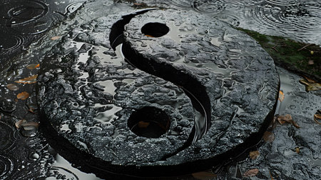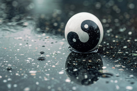 A tranquil moment unfolds as a black and white yin-yang ball rests on a rain-soaked surface, surrounded by shimmering droplets. The reflection symbolizes equilibrium in nature.