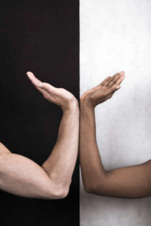 Hands of different skin complexions, black and white, are close together. The fine line of differences between the human races.