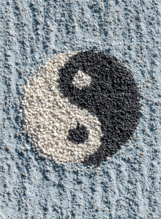 A yin yang symbol is formed from dark and light colored beads on a textured surface.