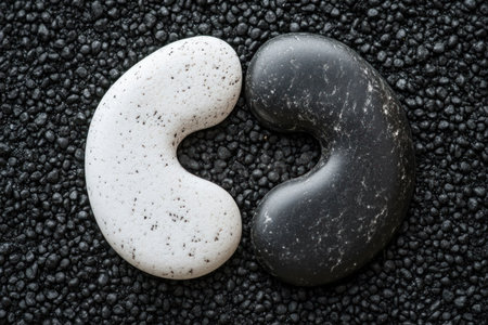 Black and white stones arranged in a yin-yang shape on black sand, symbolizing balance or harmony, zen garden background. Minimalistic, with copy space, a banner with an area for text, a concept of meditation, relaxation, and the idea of work-life balance. Top view. High detail, in a super-realistic photography style, high resolution, stock photo, photorealism. --ar 3:2 --v 6.1 Job ID: 696c04d2-0d53-433e-8bab-79117e293084