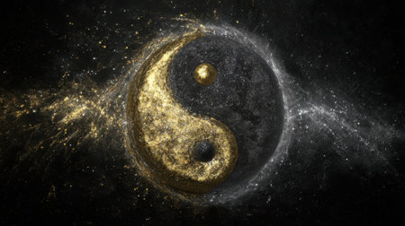 A stunning representation of the yin yang symbol surrounded by shimmering stars and cosmic elements, showing the beauty of balance and unity in a dark space.