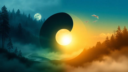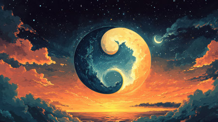 A cosmic yin and yang symbol emerges in a stunning sunset sky. The moon and sun create a harmonious balance while colorful clouds surround the scene, enhancing the celestial beauty.