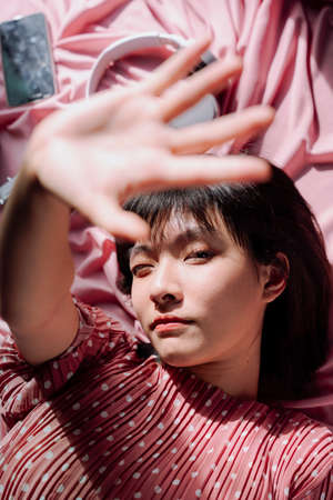 Close up - Beautiful asian thai woman short dark hair over pink background, reaching hands at camera.