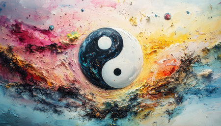 Yin yang symbol is painted on a colorful and textured canvas, representing the concept of duality and balance