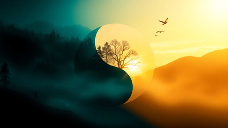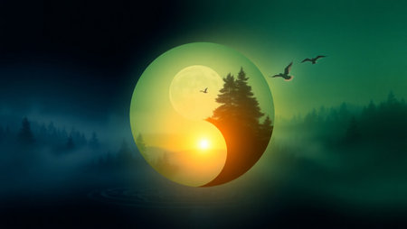 A visual representation of the Yin and Yang symbol features two trees, each with contrasting colors. One tree is bathed in warm light, while the other is in cool tones. The composition showcases intricate details, possibly for concept illustration or spiritual themes. This artwork could be applied for editorial and commercial projects.