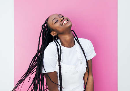 Happy woman with braids standing at pink wall outdoors with closed eyes