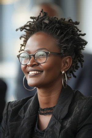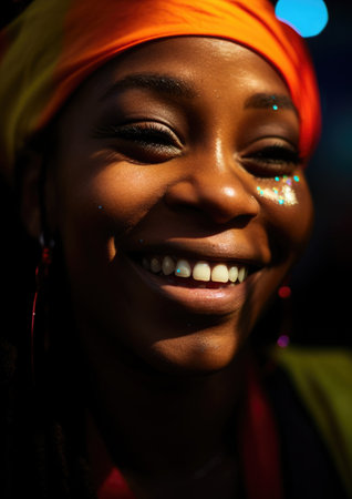 authentic portrait of black woman, facial expression with bold vivid positive emotions, African-American model laughs, intense expression, people's diversity, grained photo in 90s style, AI generated