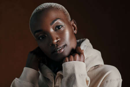 Id call my style cool and comfy. Studio portrait of an attractive young woman wearing a hoodie and posing against a brown background.