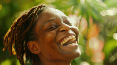 The close up picture of the person is smiling and happy that surrounded with the nature under the bright light from the sun, the feeling of the freshness that surrounded with the green nature. AIG43.