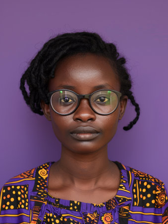 A young Black woman with locs and glasses stares intensely at the camera She is wearing a colorful patterned shirt against a purple background The photo is simple and direct, capturing her focus and determination AI Generative