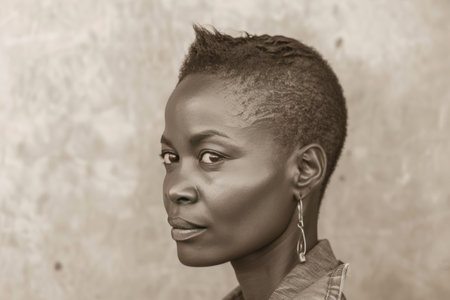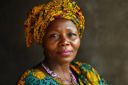 Portrait of a Senegalese mature woman wearing traditional headwrap and clothing, representing african culture and female empowerment