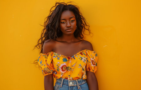 Young African-American woman wearing floral top standing confidently in front of bright yellow background