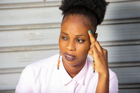 Thoughtful Afro American manin white singlet holding hand on temple trying to plan his acts and meetings.close up portrait, isolated violet background, studio shot