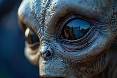 A close-up view of an alien's face, emphasizing its blue eyes and textured skin.