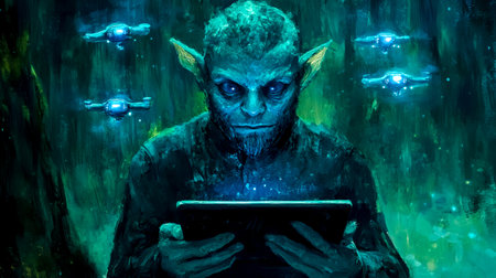 Water sprite piloting drones with digital tablet in enchanted forest