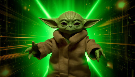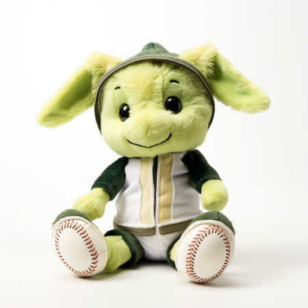 a green, stuffed animal yoda wearing a baseball hat showcases childlike innocence and charm. this contest-winning creation is a handsome, dracopunk-inspired toy that exudes dynamic and energetic vibes. its light gold and green color scheme, along with the amber accents, adds to its unique appeal. ai generated