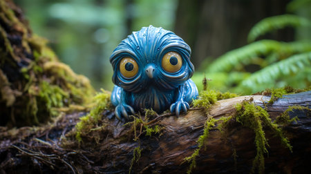 An AI generated illustration of A cartoonish alien doll against a backdrop of lush green moss.