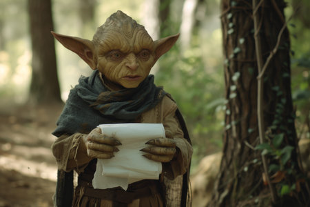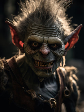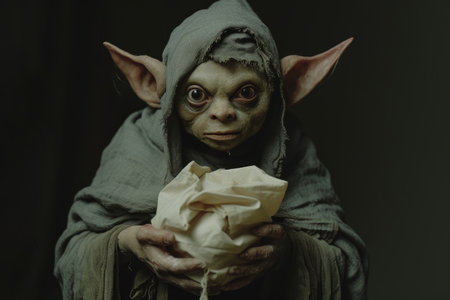 a portrait from the harry potter film series, featuring a goblin academia style. rendered in maya, this hyper-realistic sci-fi artwork showcases a hybrid creature composition. the portrait is characterized by its dark white and light black tones, high resolution, and strong lines. ai generated