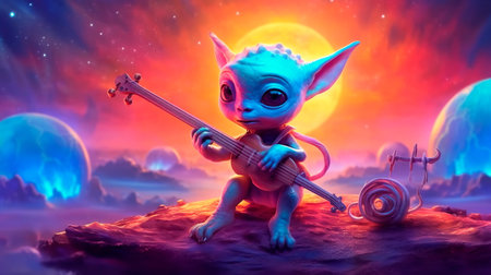cheerful baby alien playing a space musical instrument. Generative AI
