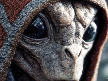 A mysterious extraterrestrial entity with intricate, mottled skin and oversized pupils peers through a shadowed hood, evoking curiosity and otherworldly allure.