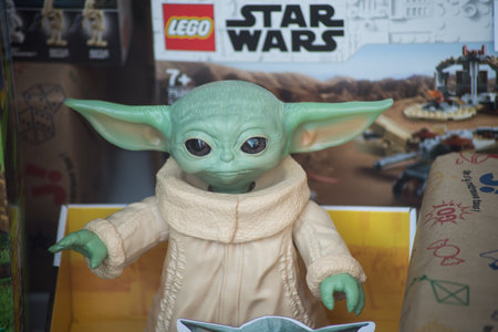 Riga,Latvia- May 16,2021: Master Yoda from Star Wars fictional character figures in children's toy store.Yoda serves as the Grand Master of the Jedi Order and as a high-ranking general of Clone Troopers.