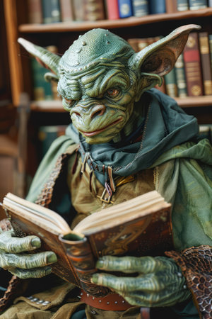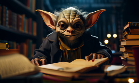 Wise alien-like character reading in a dimly lit library