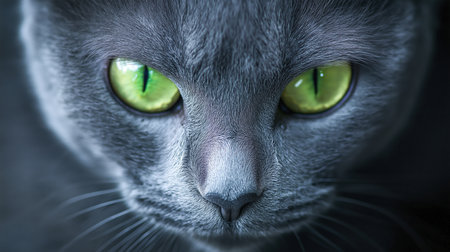 Discover the captivating beauty of a grey cat showcasing its vibrant green eyes blending elegance with mystery in this close up portrait.