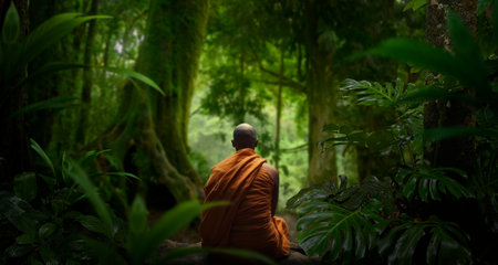 Buddhist monk sitting in the jungle and looking at the forest. Generative AI