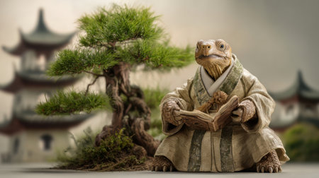 A turtle wearing a traditional outfit sits peacefully under a bonsai tree, reading a book in a tranquil garden setting with an elegant building in the background.