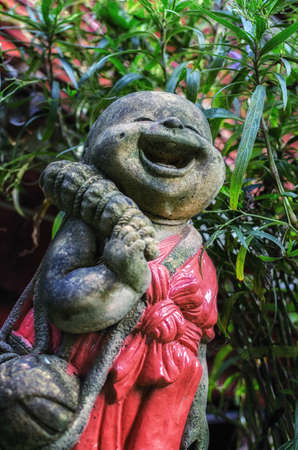 A garden ornimant ornament made out of pot in the shape of an old asian man sat next to a pond in a garden in Vietnam, Asia