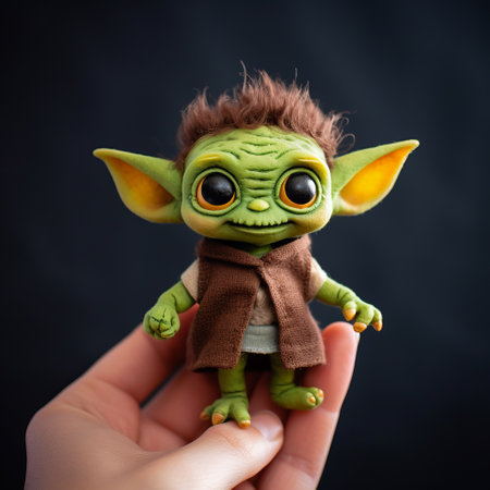 the mandalorian yoda, a handmade star wars collectible by starwarsdaily, showcases a charming character with shiny eyes. this unique piece combines elements of selective focus, goblin academia, and naive childlike aesthetics, resulting in a neo-kitsch style. the illustration of yoda also incorporates elements of yokai, making it a truly one-of-a-kind creation. ai generated