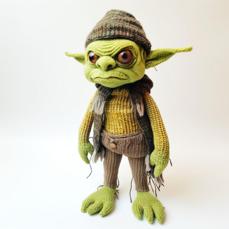 the knitted goblin, perched against a pristine white background, showcases its intricately stitched features and vibrant colors, capturing the whimsical essence of mythical creatures in a delightful handmade craft, perfect for fantasy enthusiasts and knitting aficionados alike. ai generated