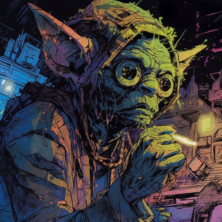 An AI generated illustration of a green alien creature smoking a joint, comic book style