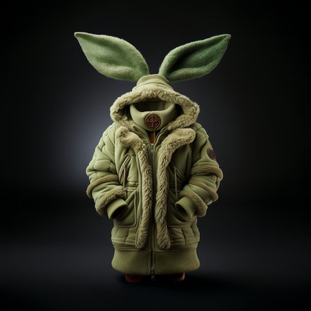 An olive green fur-lined hooded jacket with long bubby ears. AI-generated.