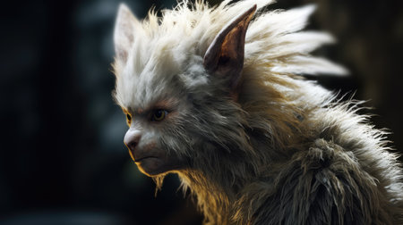 a small troll with long hair stands in front of a wooden box in this stunning 32k uhd photo. captured in the style of vray tracing, the image showcases the blink-and-you-miss-it detail of goblin academia. this close-up shot beautifully combines elements of animals and people, creating a mesmerizing visual experience. ai generated