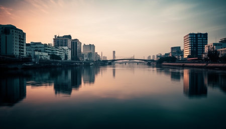 An elevated view shows a cityscape with high-rise buildings and bridges spanning a wide river. The composition features various shades of blue and orange across the sky and water, creating a tranquil environment. This image could be used for travel, urban development, or architectural design concepts.