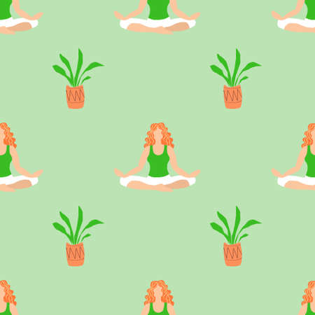 Seamless pattern of red haired girl in lotus position. Women doing exercises to design a wrapper scrap booking paper corporate identity for yoga and studio.
