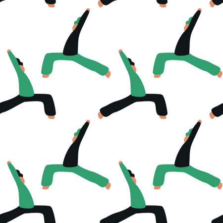 Endless background of people standing and sitting in various yoga poses. Repeatable pattern of training man and woman doing sport, practicing different asanas. Flat seamless vector illustration