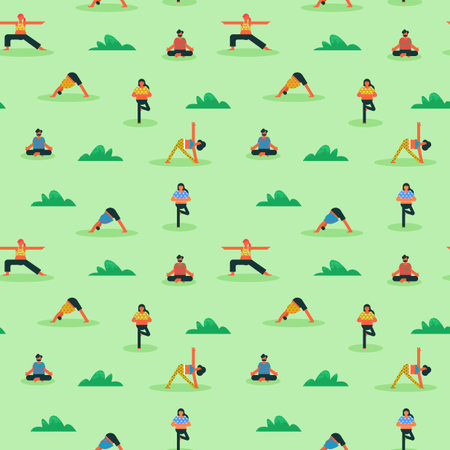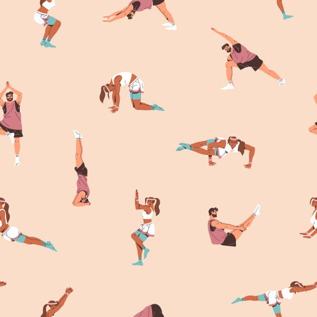 Seamless pattern of diverse people doing yoga exercise outdoor. Men and women characters in fitness background.