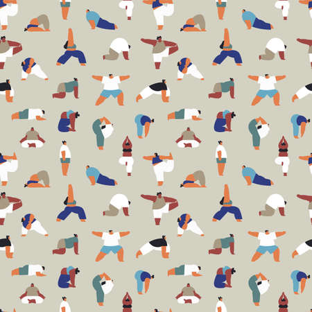 Seamless pattern illustration of diverse young people crowd doing different yoga exercise poses. Healthy lifestyle background with cartoon characters meditating.