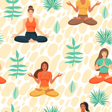 Seamless pattern with women in lotus yoga poses. Healthy lifestyle and yoga concept. People and leafs. Texture for textile, wrapping paper and packaging. Vector on abstract background.