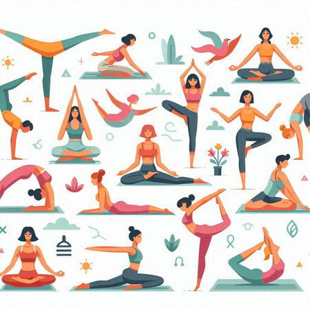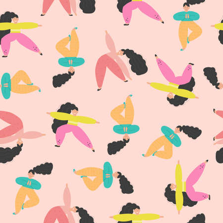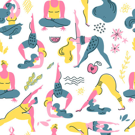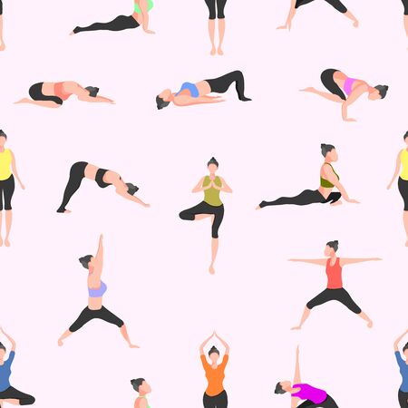 Yoga poses. Vector illustration in flat cartoon style. Seamless pattern