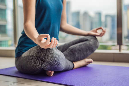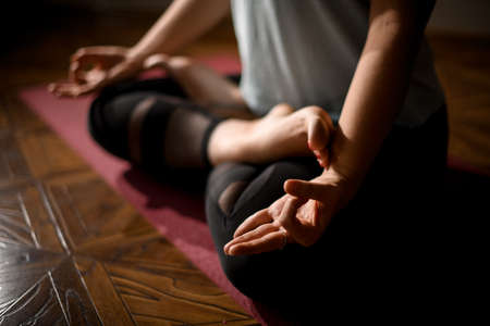 selective focus of the mudra gesture by a fit woman practicing yoga lotus pose on the exercise mat at a home interior.