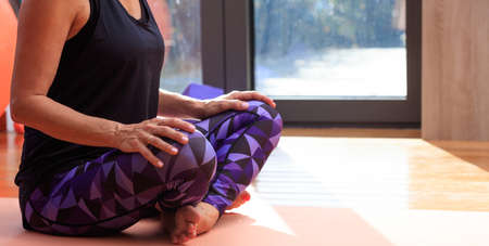 Woman in a yoga class, sitting on wooden floor, copy space