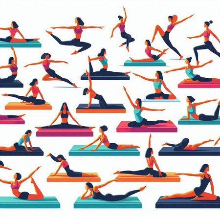 pattern seamless set of yoga. female pose mountain downward dog warrior tree bridge triangle cobra pigeon crow. vector illustration eps10