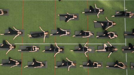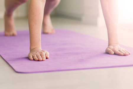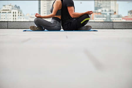 Cropped image of young healthy people doing yoga on mats