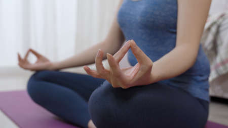 The fingers of a woman's hand are closed in a chinmudra, a close-up of mudra, yoga practice in a bright room, meditation on a sitting mat. high quality photo