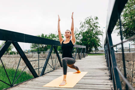 young slim woman doing yoga in the park on the wooden bridge
