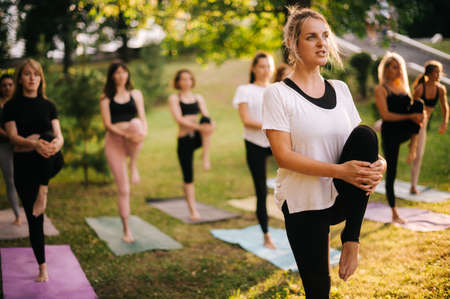 Group of girls standing in balancing pose Eka Pada Pranamasana during group yoga training in summer park
